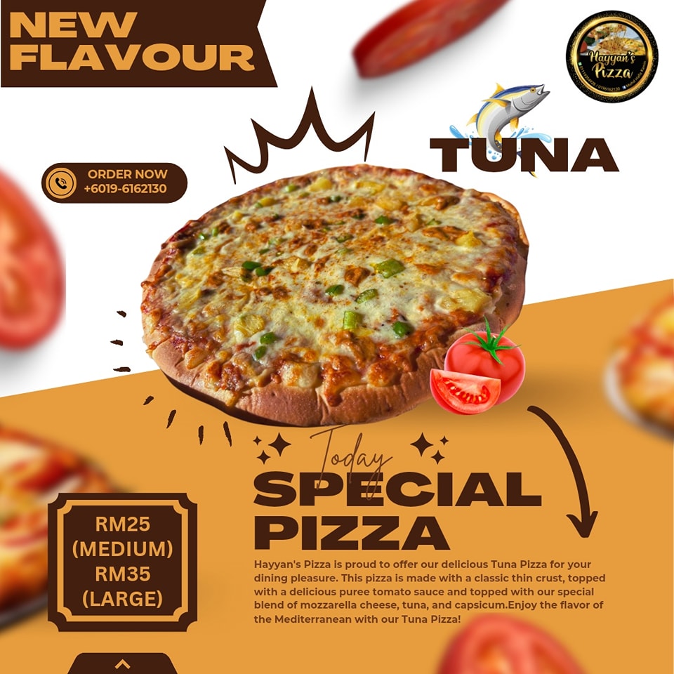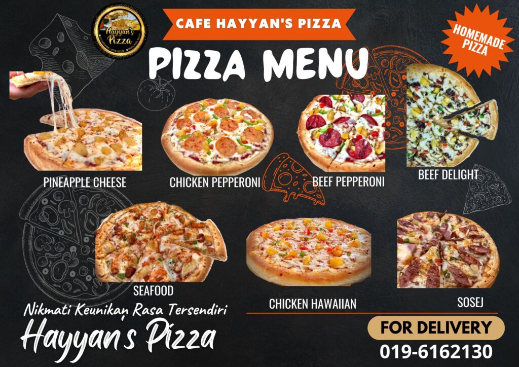 Cafe Hayyan’s Pizza menawarkan pelbagai pilihan pizza buatan sendiri yang dihasilkan menggunakan bahan-bahan halal, segar dan berkualiti tinggi. Setiap hidangan disediakan dengan penuh teliti bagi memastikan rasa yang enak serta memenuhi citarasa pelanggan.