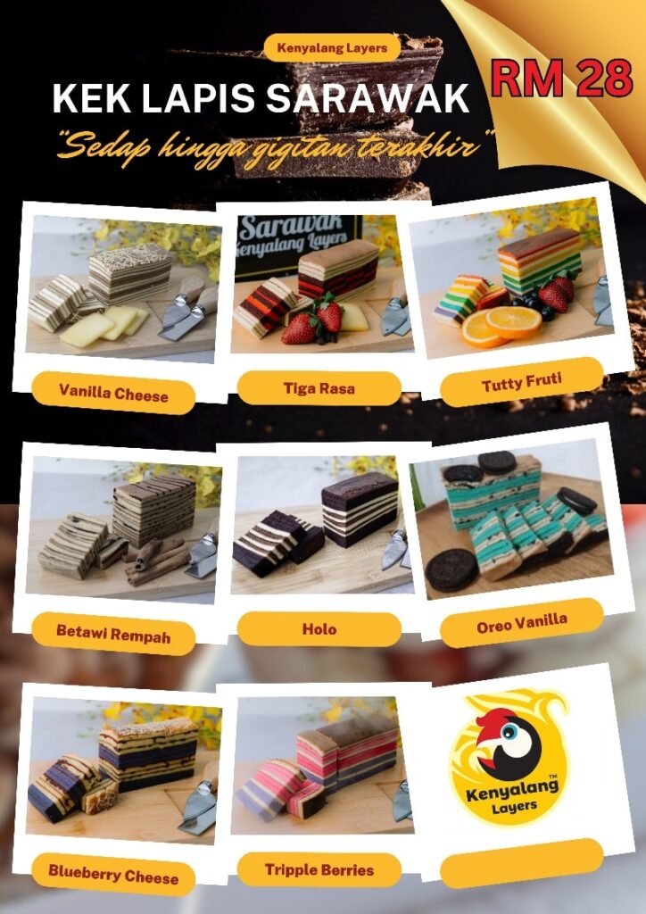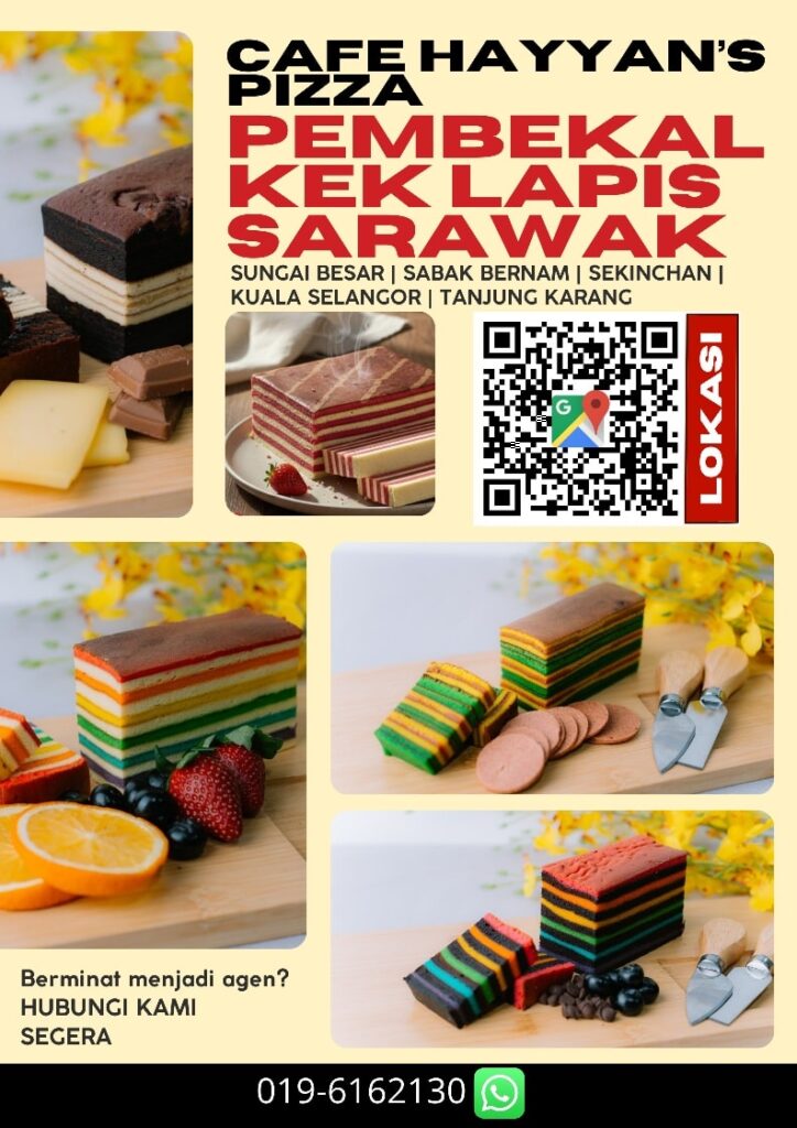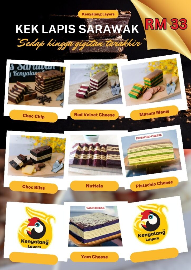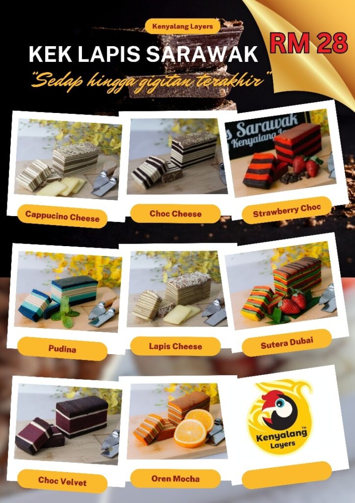 Selain itu, Kek Lapis Sarawak premium turut dibuka untuk tempahan. Kek ini dihasilkan dengan tekstur yang lembut, lapisan yang cantik serta rasa yang kaya, sesuai untuk pelbagai majlis seperti jamuan, perayaan, buah tangan dan hidangan istimewa.