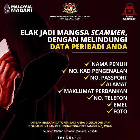 Lindungi data peribadi anda bagi mengelak daripada disalah guna oleh pihak tidak bertanggungjawab.#KPDN#AwasScammer#MalaysiaMadani#DataPeribadi