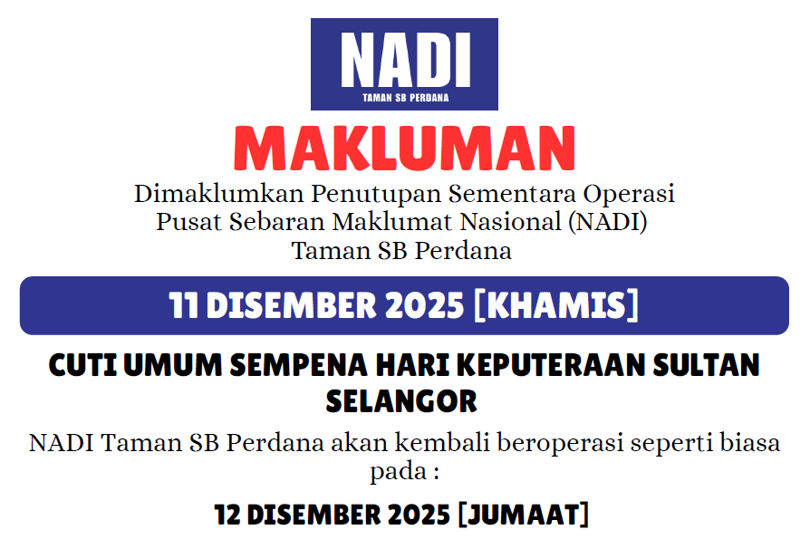 Dimaklumkan Penutupan Sementara Operasi Pusat Sebaran Maklumat Nasional (NADI) Taman SB Perdana pada 11 Disember 2025 (Khamis) bersempena dengan Cuti Umum sempena Hari Keputeraan Sultan Selangor.