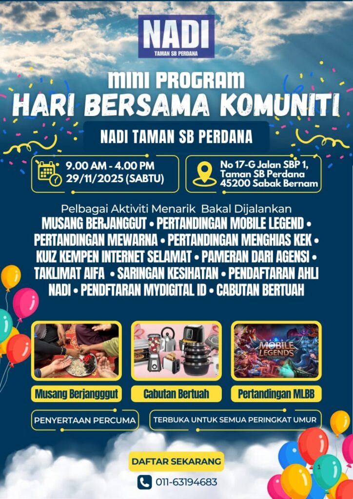 Jangan lepaskan peluang untuk sertai Hari Bersama Komuniti NADI Taman SB Perdana